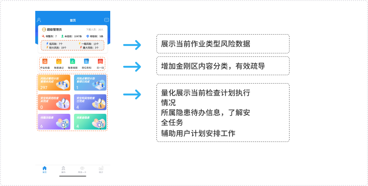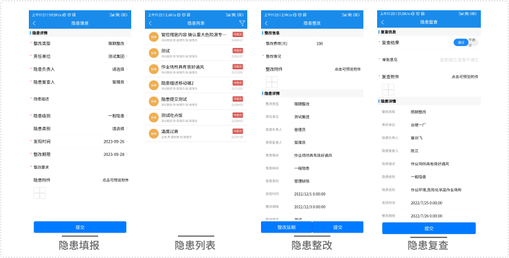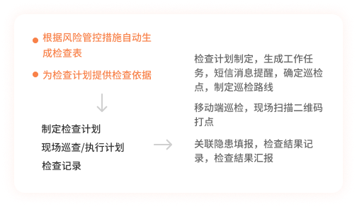 包括隱患填報、整改、復查、日常巡檢、風險點檢查、巡查檢查、等移動巡檢功能,及風險點查看、崗位告知、息查看的數據查看功能。